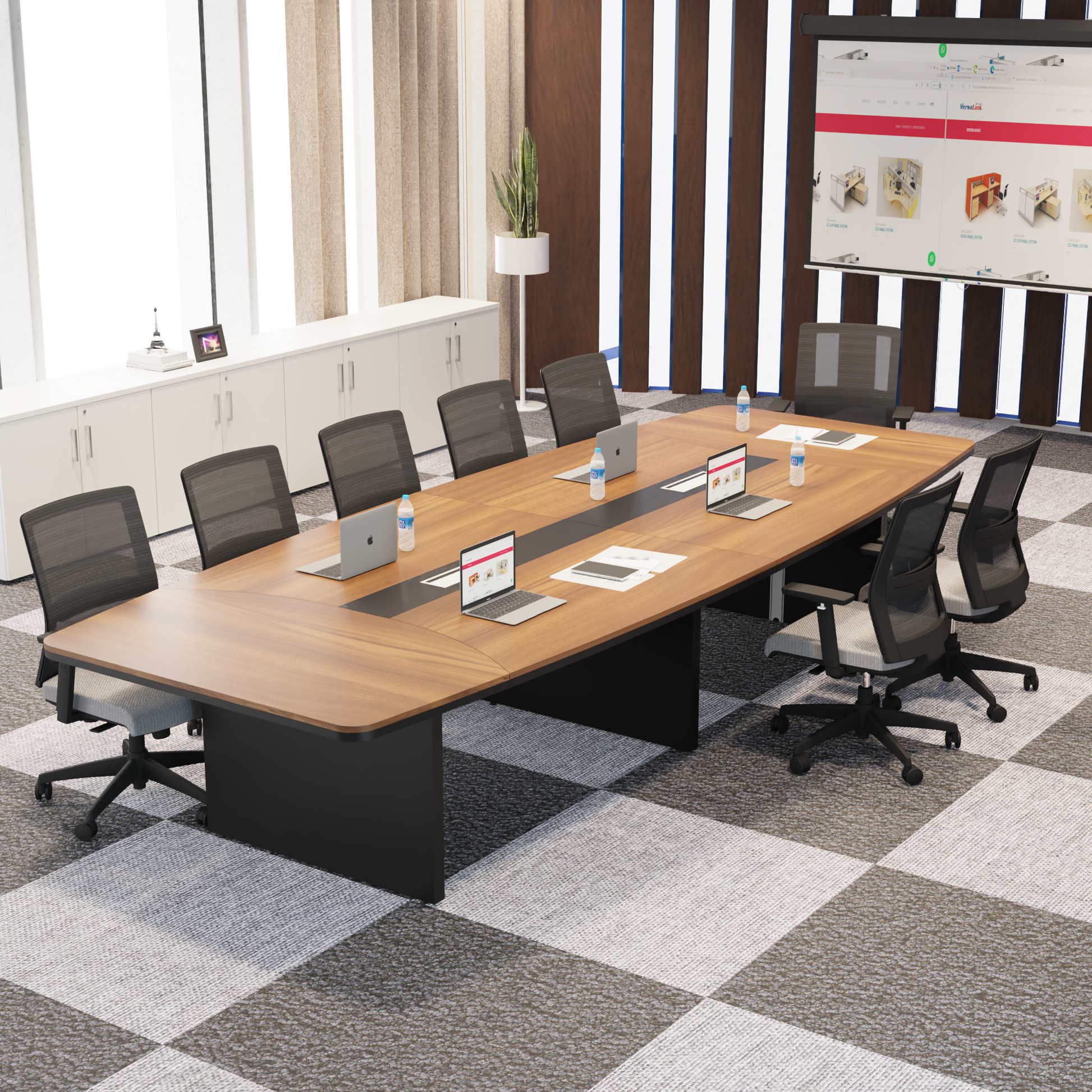 Meets with panel leg that is made from melamine faced chipboard in black with 50mm thickness that ensures the stability and strength of the meeting crowd at the table. The center of the table top is highlighted with a sleek black design feature(MFC) that represents wire management for a more professional look in the office.