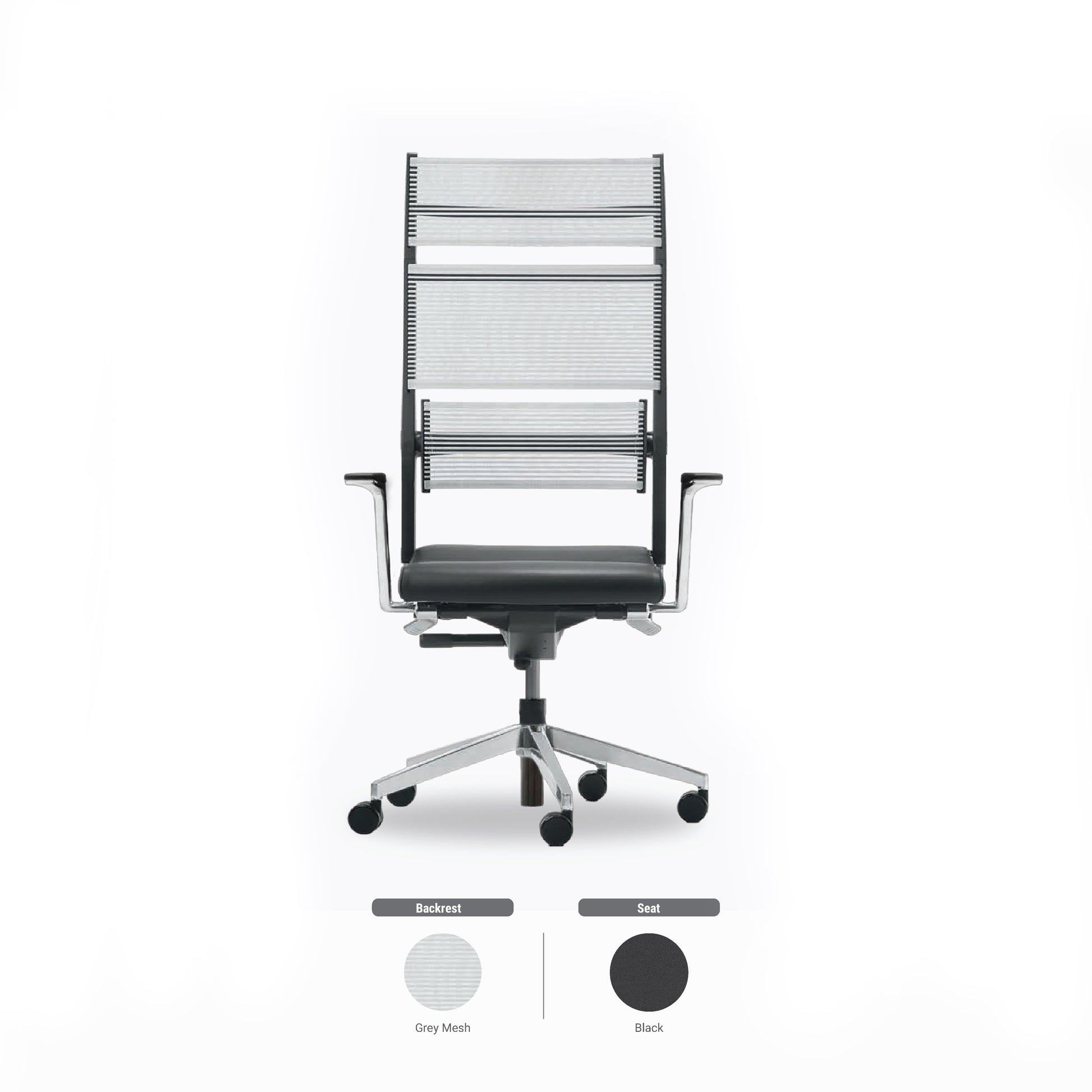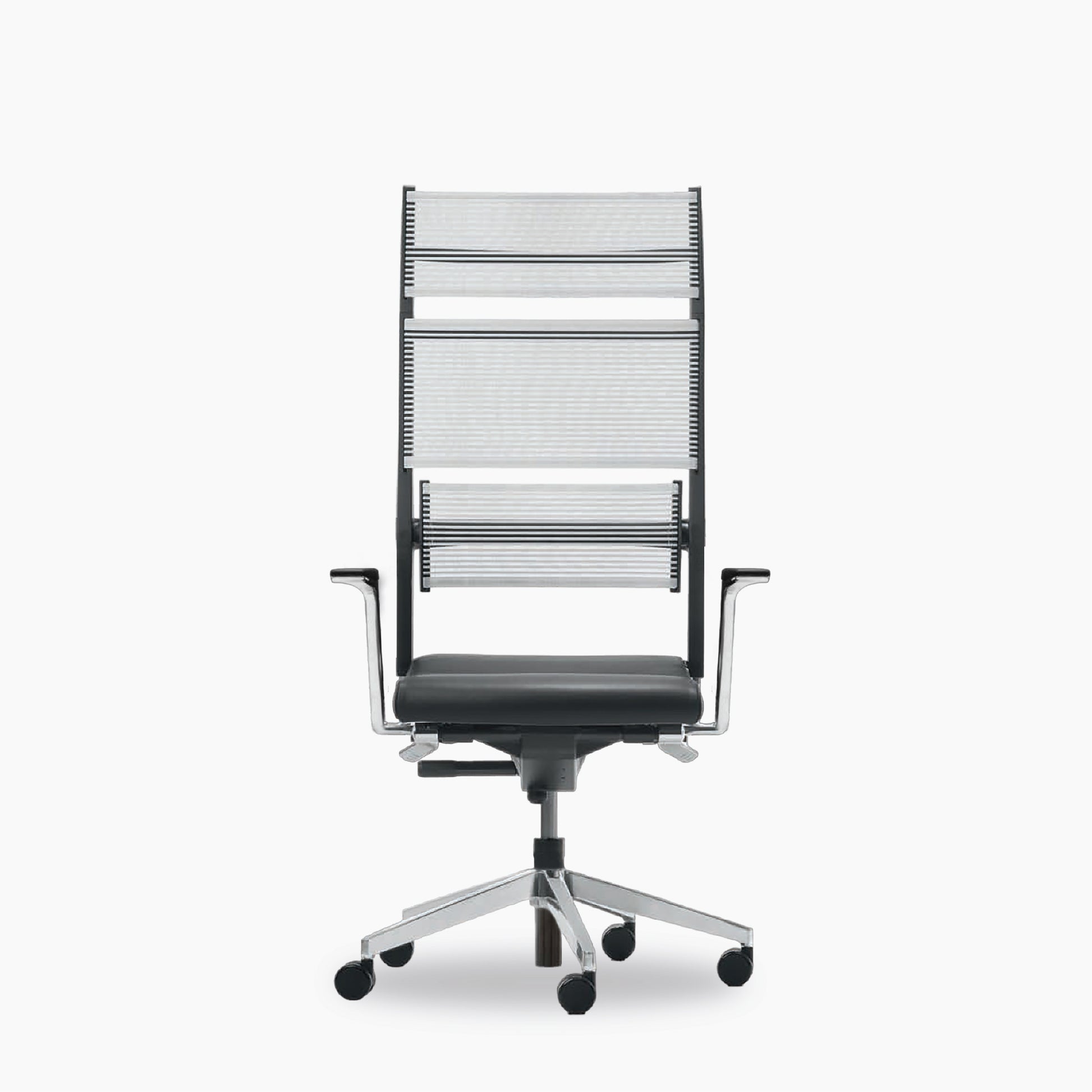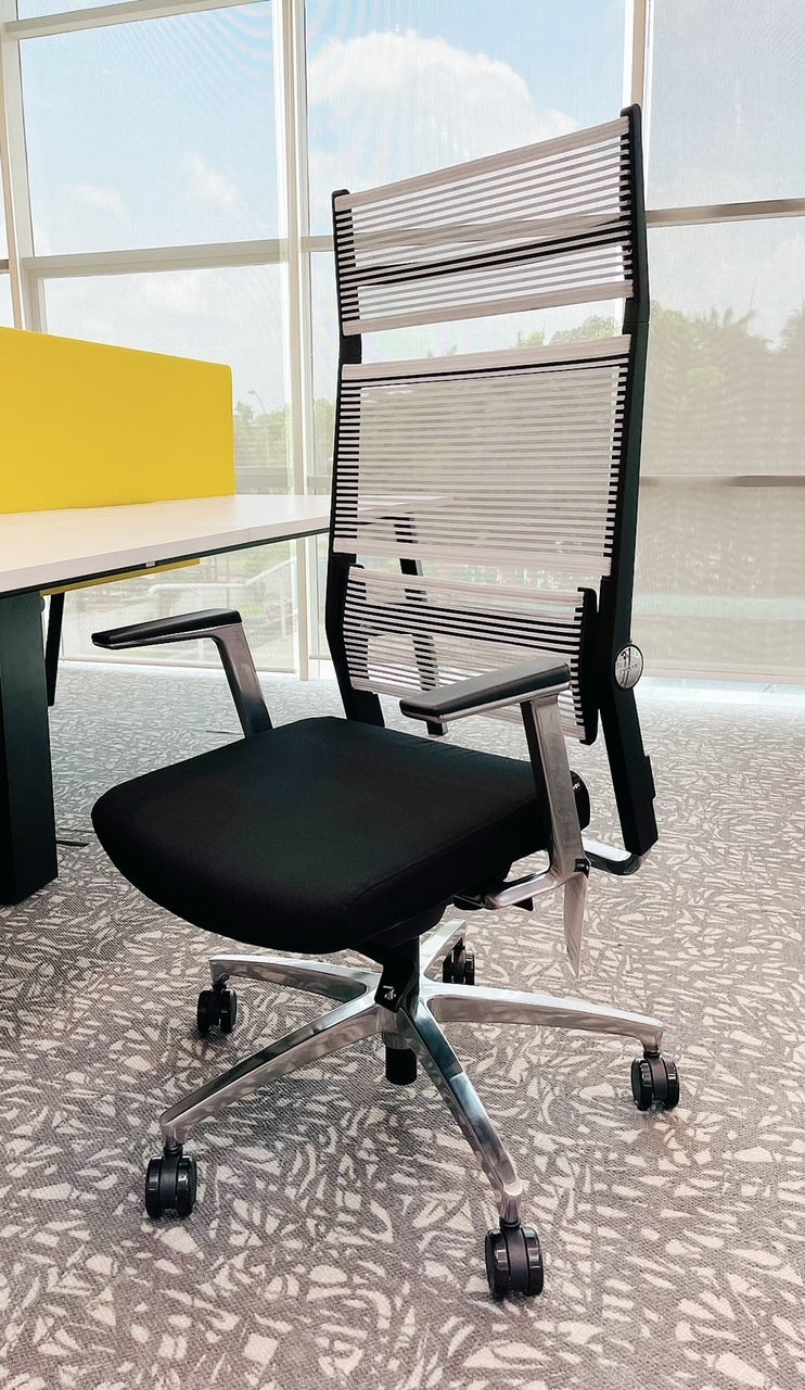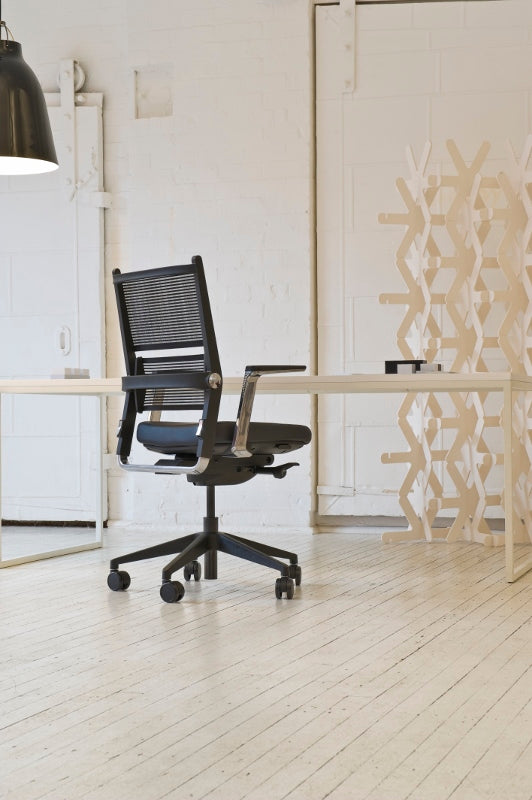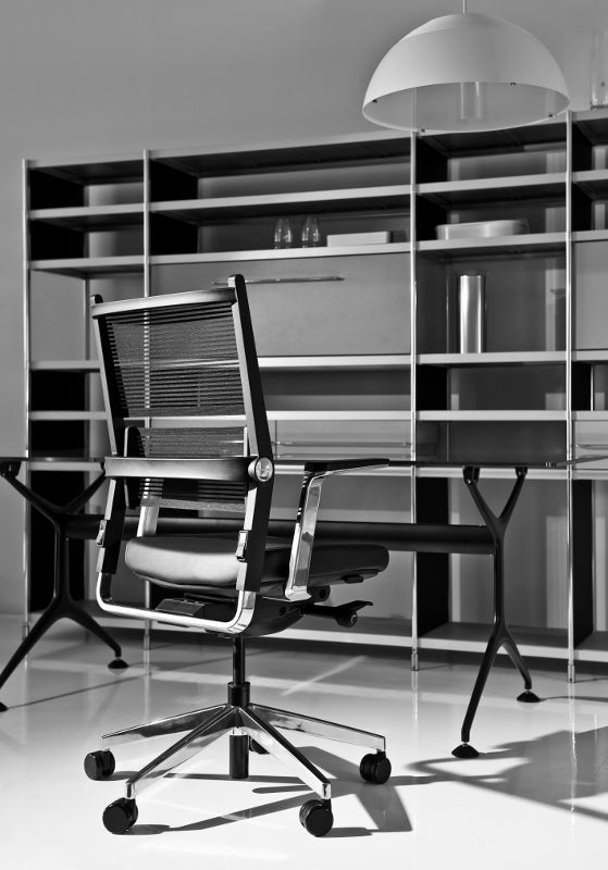 Executive Office Chair Lordo is an absolute top design with an innovative approach for supporting the back using a transparent, pressure-regulating fabric which is elastic over its entire area and a simple, self-aligning lumbar support. What so ingenious about Lordo is the clarity of lines. It has an imposing appearance and yet is elastic and soft as soon as you sit back on it. This is all thanks to it's lightfast and flexible woven fabric. The fabric is made of polyester and has Lycra threads specially woven into it, available in light grey.